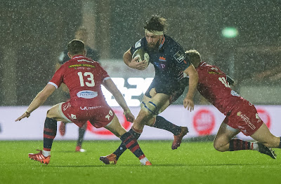 Die Partie zwischen den Scarlets und Edinburgh Rugby bot zwei bisherige Enttäuschungen der Saison auf; immerhin hatte das Heimteam schon einen knappen Sieg holen können, während die Gäste in den drei vorherigen Partien glücklos war. In strömenden Regen war jedoch kein richtig flottes Rugby-Spiel zu bestreiten, somit wurde die Partie ein Kampf um Meter, Fehlern und Geduld. Die ersten Punkte konnte #10 Jaco Van der Walt für die Gäste in der Nachspielzeit der ersten Hälfte erzielen, als er einen Straftritt verwandelte. Mit dem 0: 3 im Rücken spielten die Scarlets zu Beginn der zweiten Hälfte konzentrierter, und wurden in der 51. Minute mit einem Straftritt belohnt, den #10 Angus O'Brien sicher verwandelte. Allerdings störte der eingewechselte #18 Werner Kruger immer wieder die Gedränge, was ihm in der 58. Minute eine gelbe Karte und der dazugehörige Straftritt durch Van der Walt die 6: 3 Führung für die Gäste einbrachte. Es kam noch schlimmer für die Scarlets: wegen eines hohen Tacklings sah #4 Josh Helps die rote Karte und die verbleibenden knapp zwanzig Minuten waren die Waliser in der Unterzahl. Edinburgh schaukelte so diesen mageren Sieg nach Hause - es ist immerhin ein Anfang...